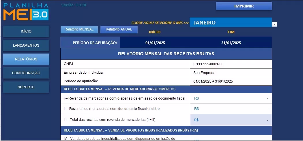 – Relatório Pronto para a Declaração Anual (DASN-SIMEI): Com um clique, a planilha te entrega o valor exato e consolidado do seu faturamento bruto anual. É só copiar e colar no site do governo. Acabe com o estresse da declaração!
